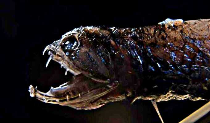 Sus dientes transparentes y su cuerpo oscuro hacen a esta especie de aguas profundas invisible para sus presas.