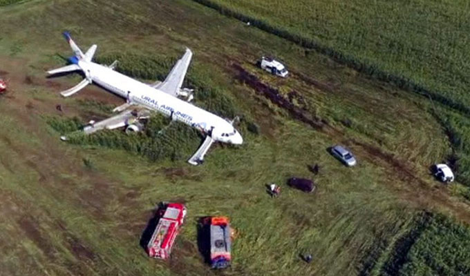 Rusia. Un avión con 226 pasajeros y siete tripulantes a bordo, se vio obligado a realizar un aterrizaje de emergencia este jueves en un campo sembrado de maíz en la región de Moscú, luego de que una bandada de pájaros se chocara contra este.