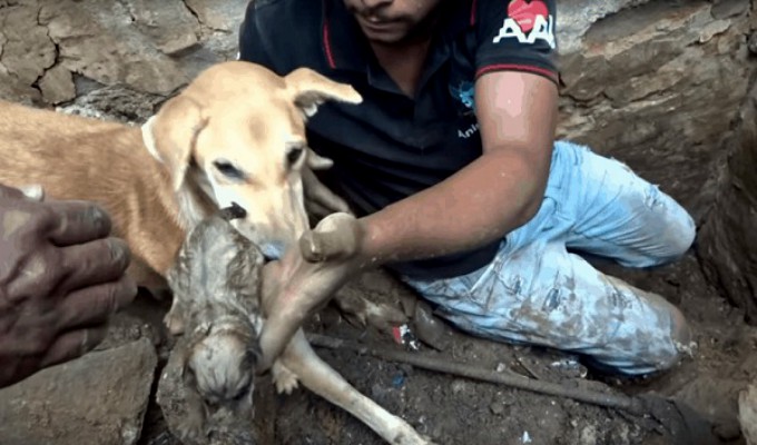 El can empieza a escarbar porque sabe que sus crías siguen con vida. Antes, condujo hasta el punto exacto donde se hallaban sus cachorros a los miembros de la asociación de rescate Animal Aid Unlimitedy, avisados por los ladridos de la perra.