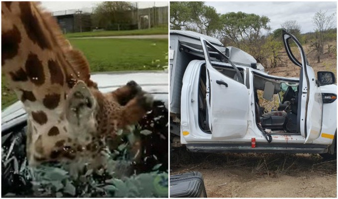 Sucedió en Sudáfrica. Un vehículo conducido por un grupo de turistas atropelló a un jirafa en una carretera del Parque Kruger. Tras el accidente, el pacífico espécimen cayó sobre el auto y aplastó a los ocupantes, dejando al conductor gravemente herido.