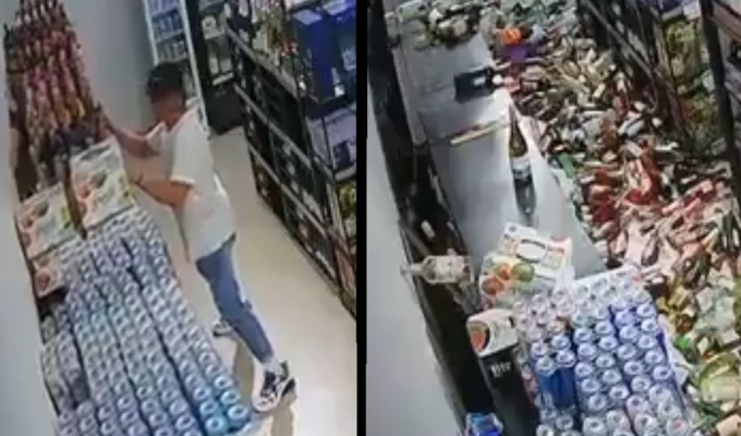Su buena intención quedó registrada en el video que grabó una cámara de seguridad, un minuto después de que se registrara ese temblor al noroeste de Jamaica y las estanterías del local empezaran a moverse de lado a lado.