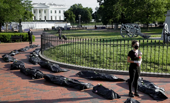 EEUU: Más de cincuenta bolsas negras que simbolizaban personas fallecidas por coronavirus permanecieron en los exteriores de la residencia presidencial.
