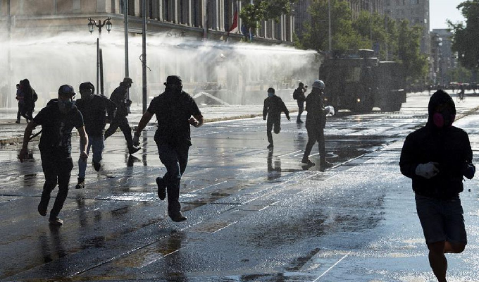 Los manifestantes denunciaron que, la militarizada policía de Carabineros disparó gases y chorros de agua contra ellos, quienes se defendieron lanzaron piedras a los agentes.