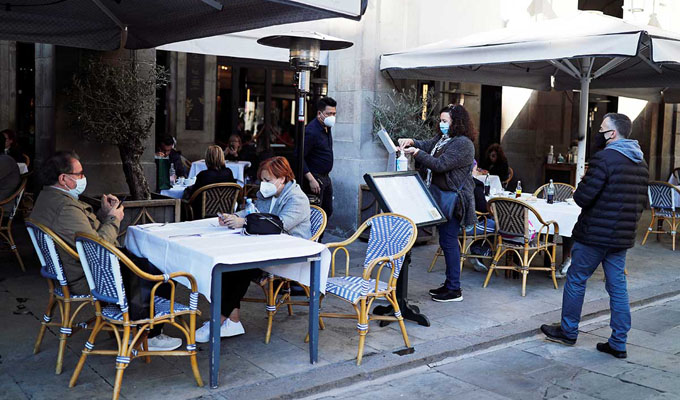 En España, hoy los camareros y los clientes volvieron a ocupar las aceras de Barcelona, luego que las cafeterías y restaurantes de la ciudad reabrieron tras la relajación de las restricciones contra el coronavirus.