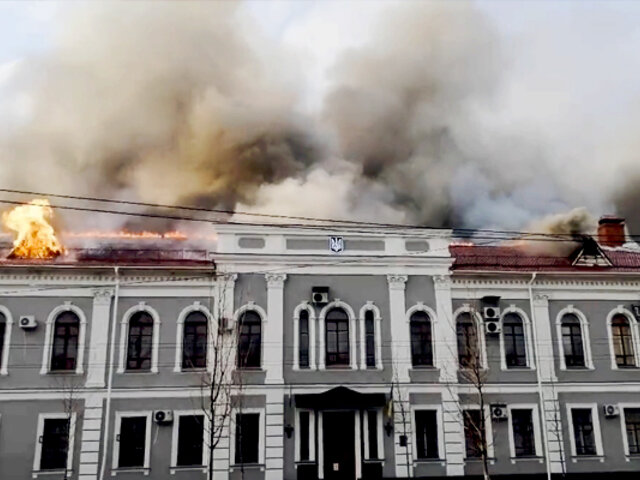 Algunos medios extranjeros informaron que el departamento de seguridad de Chernihiv en Ucrania fue bombardeado por tropas rusas y la estructura se encuentra en llamas.