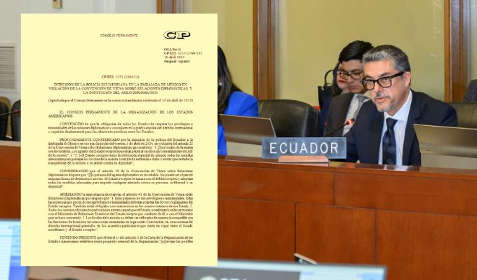 "Con 29 votos a favor, un voto en contra, una abstención, y dos países ausentes, el Consejo Permanente aprobó la resolución ‘Intrusión de la Policía Ecuatoriana en la Embajada de México en violación de la Convención de Viena sobre Relaciones Diplomáticas, y la Institución del Asilo Diplomático’", se lee en una publicación de la entidad internacional en su cuenta oficial del X (antes Twitter).