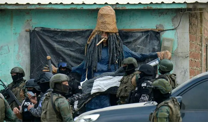 Según revelaron los policías, el muñeco era idolatrado por los integrantes de las sanguinarias bandas Latin Kings y Chone Killers, que prácticamente tiene tomada los alrededores de la ciudad de Duran, donde constantemente imponen sus leyes y desatan masacres contra grupos rivales.