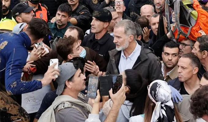 Pese a las agresiones, el rey Felipe VI siguió avanzando por una de las calles principales de esta castigada localidad y trató de tranquilizar a los cientos de damnificados, muy alterados tras cinco días del desastre que provocó la riada, que se llevó todo a su paso, además hay decenas de desaparecidos que son intensamente buscados.