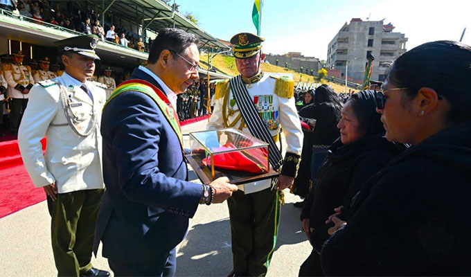 En la ceremonia, el jefe de Estado boliviano rindió emotivo homenaje al sargento segundo Jesús Mamani y a los subtenientes Carlos Apata, Brayan Barrozo y Cristian Calle, quienes, indicó, "fueron abatidos de manera artera, cruel e inhumana por los manifestantes".