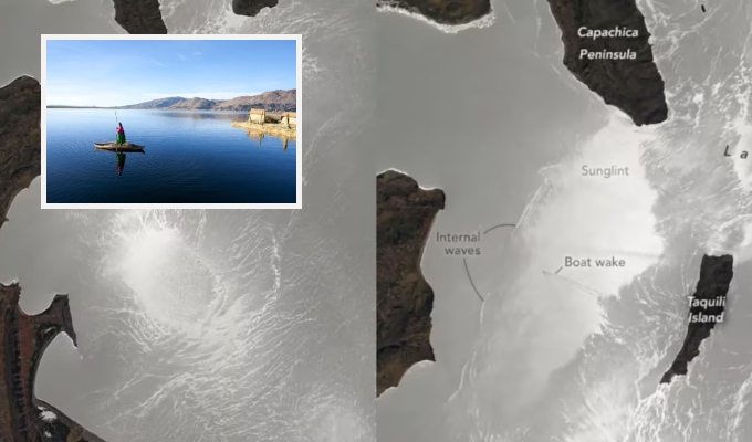 Gracias al reflejo solar, se identificaron ondas internas en el lago Titicaca, visibles como líneas paralelas brillantes en la imagen satelital, que normalmente pasan desapercibidas a simple vista. Estas ondas, generadas por flujos de agua profunda que impactan contra acantilados submarinos, se observan cerca de las orillas, revelando la compleja dinámica acuática del lago. Además, se detectaron estelas en forma de “V” dejadas por embarcaciones, destacando desplazamientos hacia el oeste y evidenciando la actividad humana en el cuerpo de agua.