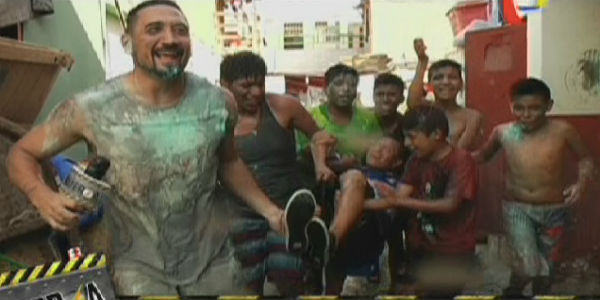 Víctor Hugo Dávila llegó hasta el rico Bondy, el barrio del queridísimo Chacalón, en La Victoria, para celebrar la fiesta de los carnavales. Nadie se salvó del agua, la pintura y el talco.