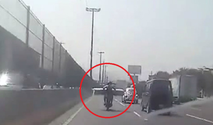 Por ejemplo, un motociclista que transitaba por la carretera Panamericana Norte, transportaba un enorme rollo de tela. Asimismo, se le aprecia que movilizarse de uno a otro carril sin importar poner en riesgo su vida y la de los demás conductores.