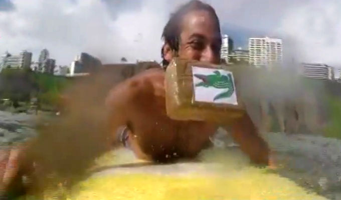 Para suerte del reportero de la “Noche Es Mía”, las aguas del balneario de Playa Blanca estaban más tranquilas que de costumbre y le permitieron ingresar hasta una distancia considerable. Tras unas idas y vueltas, el “Loco Wagner” al fin pudo encontrar lo que tanto había buscado: un paquete con la marca de un cocodrilo.