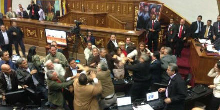 El presidente del Partido Voluntad Popular, Leopoldo López mostró la fotorafía de los congresistas venezolanos María Corina Machado y Julio Borja, quienes resultaron agredidos por los oficialistas en la gresca que se produjo el último martes.