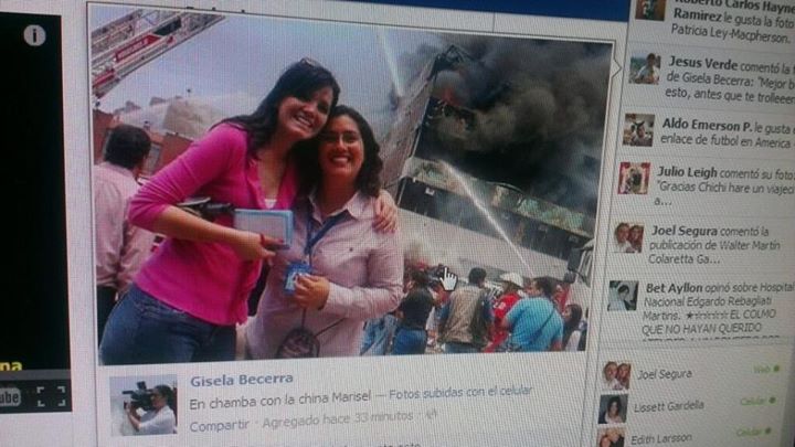 Las reporteras Gisela Becerra y Marisel Linares encendieron las críticas en las redes sociales, tras publicar una fotografía durante la cobertura del incendio que se registró en el almacén de llantas, ubicado en la avenida Nicolás Arriola, en La Victoria.