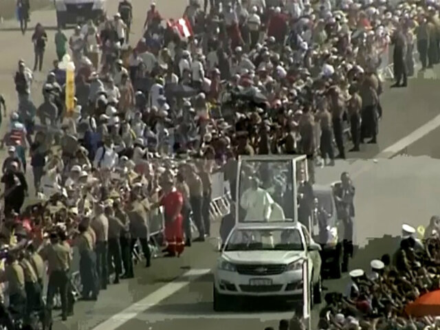 Previo a la ceremonia el Papa Francisco recorrió la base aérea para saludar a los fieles católicos a bordo del característico 'papamóvil'. El Santo Padre tuvo un caloroso recibimiento por parte de las personas que lo esperaban para realizar la misa.