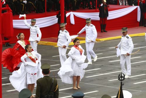 Los cadetes de la Escuela Militar de Chorrillos participaron nuevamente en la Gran Parada Cívico Militar por 28 de Julio, con una aplaudida marinera norteña, que cautivó a todos los asistentes.