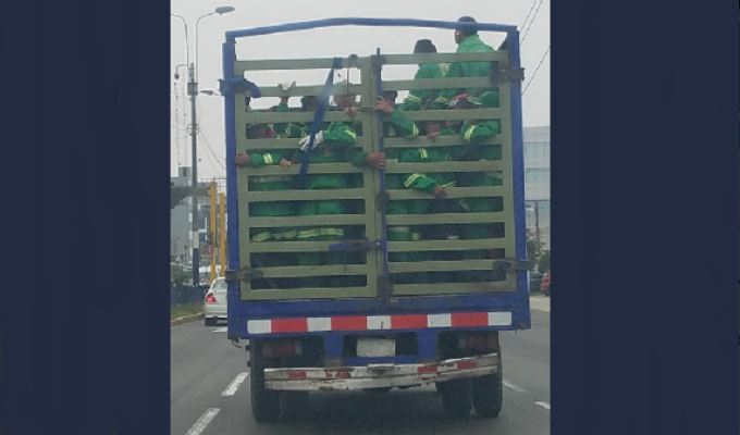 Como registra la fotografía tomada a la altura de la avenida Huaylas camino al óvalo de Chorrillos, un camión cuya fachada consigna pertenecer a la comuna del distrito, traslada a los colaboradores del ornato de la ciudad, "como si fueran ganado y sin ninguna consideración y respeto", según describieron cibernautas en redes sociales.