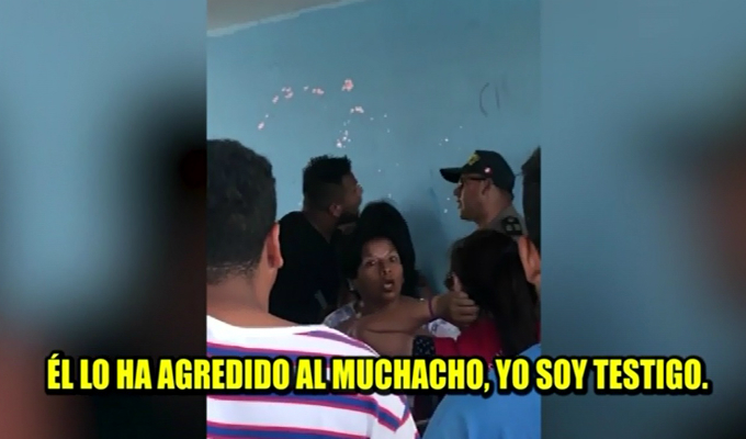 Como se observa en imágenes, un joven sostiene una acalorada discusión con un efectivo de la policía, mientras que una mujer asegura que el agente policial lo agredió. “Al muchacho lo ha zamaqueado”, asegura.