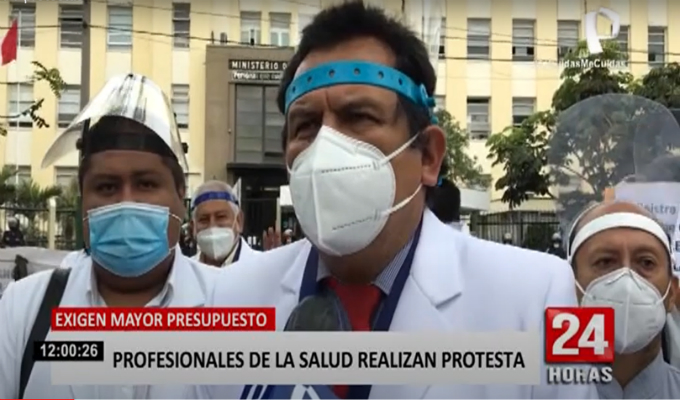 Un grupo de profesionales de la salud se reunieron en los exteriores del Ministerio de Salud para protestar por el aumento del presupuesto al sector salud. Añadieron que solo tienen el 2.3% del PBI, que es menos de la mitad del promedio latinoamericano.