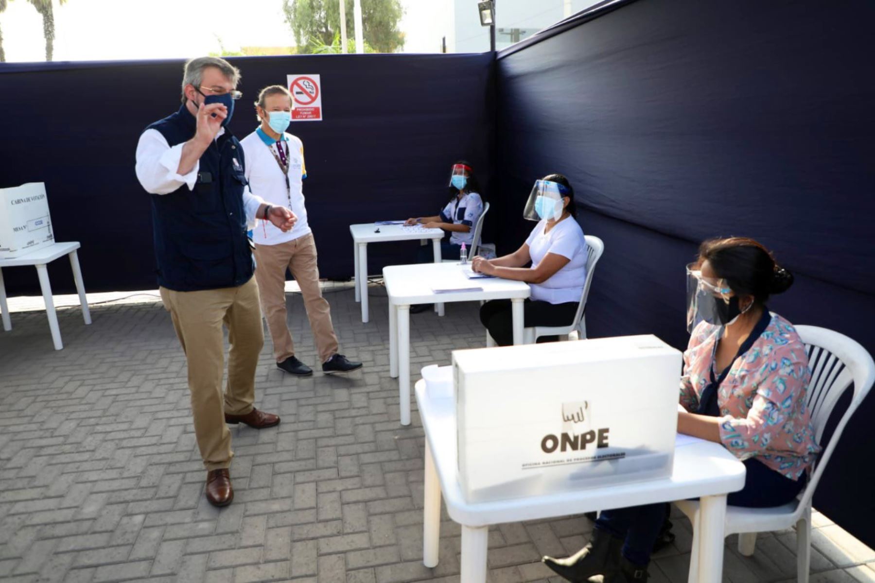 En estos espacios abiertos se instalará toldos, bajo los cuales estará la mesa de sufragio y cabinas de votación con una distancia de dos metros. ONPE vigilará en forma estricta el cumplimiento de los protocolos de seguridad y prevención contra el COVID-19.