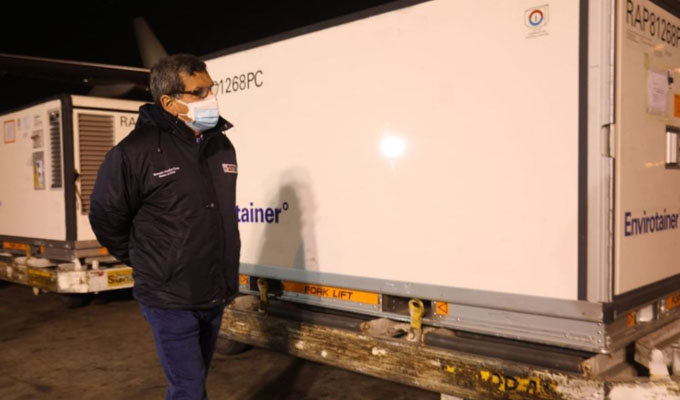 “Está llegando el cargamento más grande que ha arribado a nuestro país, pues se está descargando más 3 millones 300,000 vacunas, y mañana llegan más de 700,000 vacunas para completar 4 millones entre sábado y domingo”, señaló.