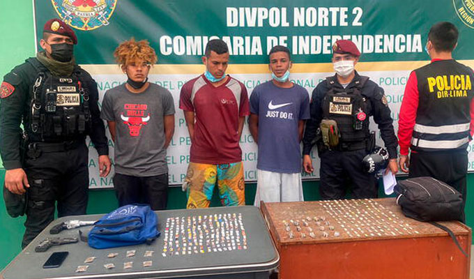 Se les encontró 509 ketes con pasta básica de cocaína, ocho bolsitas con marihuana y dos réplicas de armas de fuego. Ellos pertenecerían a la banda de Los Malditos de Aragua, que se dedicarían a la microcomercialización de droga en la zona y asalto a transeúntes.
