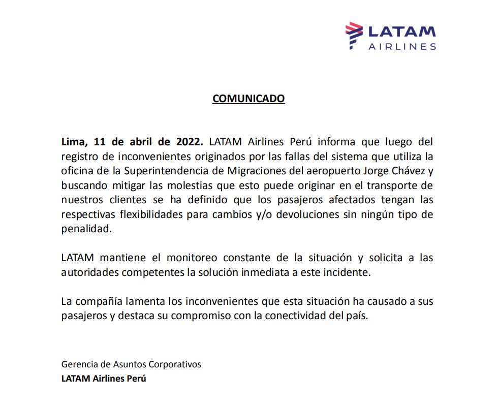 La aerolínea LATAM Airlines Perú, informó que brindará flexibilidades para cambios y/o devoluciones sin ningún tipo de penalidad, para los usuarios que se hayan visto afectados debido a las fallas del sistema de la Superintendencia de Migraciones del aeropuerto Jorge Chávez.