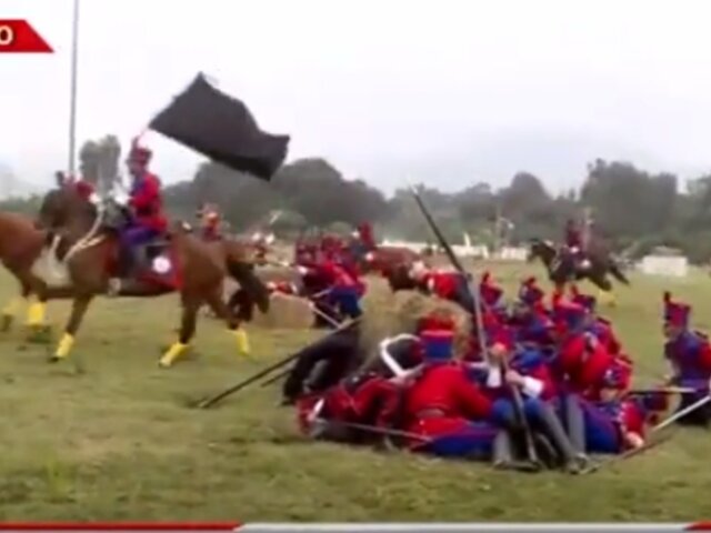 Escenificación muestra a Húsares de Junín montados en caballos combatiendo a las fuerzas realistas.