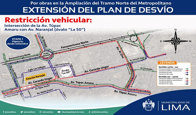 El plan de desvíos comprende la restricción vehicular (por etapas) en la intersección de las avenidas Túpac Amaru y Naranjal (óvalo “La 50”), ubicada entre los distritos de Comas, Independencia y Los Olivos.