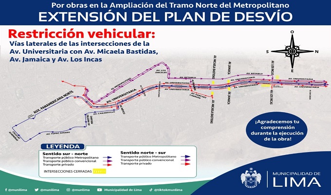 Por su parte, el transporte público convencional, en el sentido sur a norte, deberá ir por la Av. Retablo para retomar la Av. Universitaria a la altura de la Av. Los Incas.