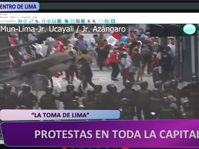El enfrentamiento con los afectivos policiales fueron captados por las cámaras de video vigilancia de la Municipalidad de Lima. Según se puedo conocer que los manifestantes intentan llegar a las inmediaciones del Congreso de la Republica.