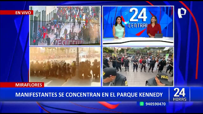 Se puede ver que el punto de concentración habría sido el turístico parque Kennedy donde decenas de protestantes levantaron sus carteles y banderolas, delante de los efectivos de la policía nacional.