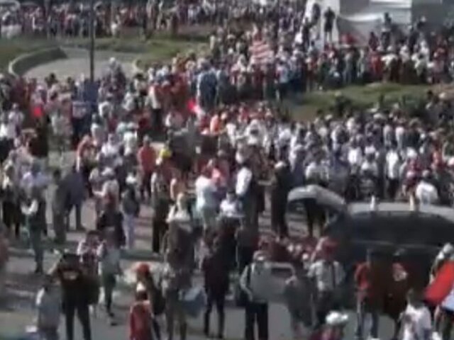 Grupo de manifestantes provenientes de Ayacucho, Madre de Dios y otras regiones del interior del Perú vienen desplazándose por la avenida Tacna con dirección a la Plaza San Martín. Previamente, el grupo de personas se había reunido en la Plaza 2 de mayo.