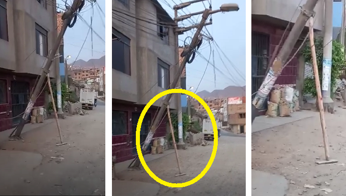 En el pasaje los Tulipanes del distrito de Independencia, un poste de alumbrado público estaría siendo sostenido por un palo de madera, para evitar que se caiga.