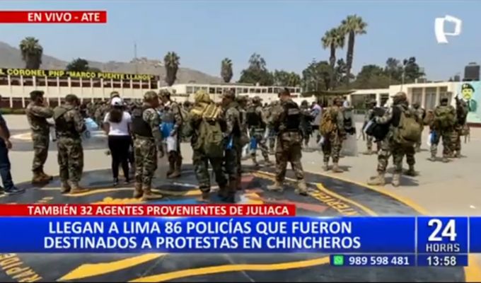 Efectivos de la Diroes de la Policía Nacional del Perú (PNP), específicamente 32 quienes estuvieron en Juliaca y 86 que estuvieron en Chincheros, todos para contener las violentas manifestaciones en el sur del país, llegaron a Lima.