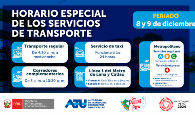 ¡Atención usuarios! La Autoridad de Transporte Urbano para Lima y Callao (ATU) informa sobre los horarios que tendrán los servicios de transporte público los días viernes 8 y sábado 9 de diciembre, feriados por el Día de la Inmaculada Concepción y la Batalla de Ayacucho, respectivamente.