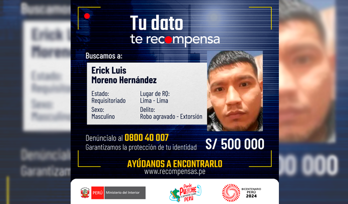 El Mininter ofrece una recompensa de medio millón de soles por información que permita su captura. Cualquier persona que tenga datos sobre su paradero puede comunicarse de manera anónima con la línea 0800-40-007.