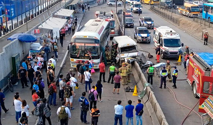 Tras impactar contra el bus, la combi colisionó contra el muro de concreto que separa la vía auxiliar de la Panamericana Norte. Algunos pasajeros de la unidad menor quedaron atrapados entre los asientos, fueron liberados por los hombres de rojo.