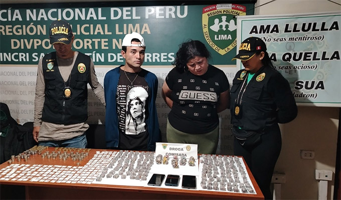 Por otro lado, tras una ardua investigación y en cumplimiento a una orden judicial, agentes del Grupo Terna allanaron un inmueble en San Martín de Porres, logrando la captura de Jesús Infante (28) y Patricia Montaje (26), quienes se dedicaban a la microcomercialización de droga. Más de 3000 ketes de pbc y cerca de 200 envoltorios de cocaína fueron decomisados.
