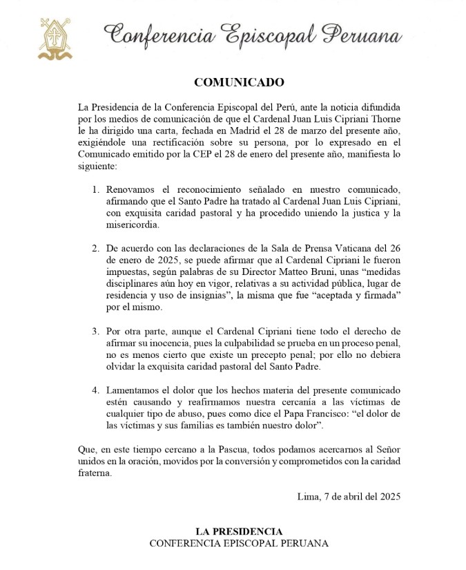 La Conferencia Episcopal Peruana (CEP) rechazó rectificarse con el cardenal Juan Luis Cipriani, quien había solicitado una disculpa pública por el pronunciamiento de la entidad sobre las sanciones por presunta pederastia que el Vaticano le impuso. La CEP ratificó su postura en un comunicado emitido este lunes, 7 de abril.