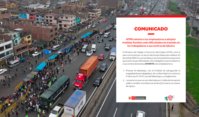 El paro de transportistas convocado para este jueves 10 de abril del 2025 ha generado preocupación entre trabajadores y empleadores en Lima. En respuesta, el Ministerio de Trabajo y Promoción del Empleo (MTPE) emitió un comunicado en el que “exhorta a los trabajadores a adoptar flexibles ante dificultades de traslado de los trabajadores a sus centros de labores”. La medida se da en el contexto de las “constantes amenazas y muertes” sufridas por conductores del transporte público, lo que llevó a un sector del gremio a suspender sus servicios de manera indefinida.