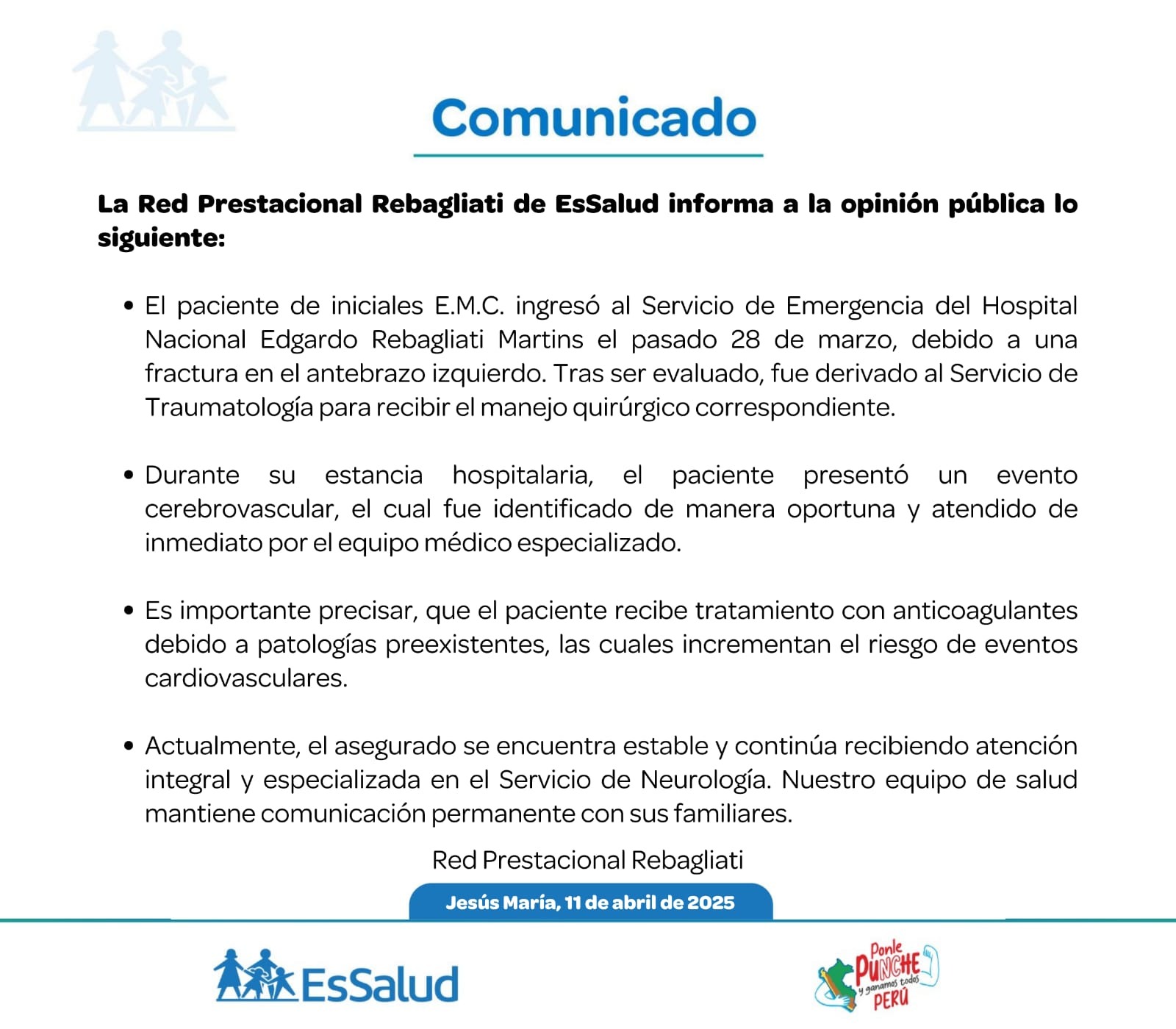 Ante las denuncias, la Red Prestacional Rebagliati emitió un comunicado en el que afirma que Mamani sufrió un evento cerebrovascular durante su hospitalización. Asimismo, precisaron que fue atendido “de manera oportuna” por el equipo médico y que su estado actual es estable.