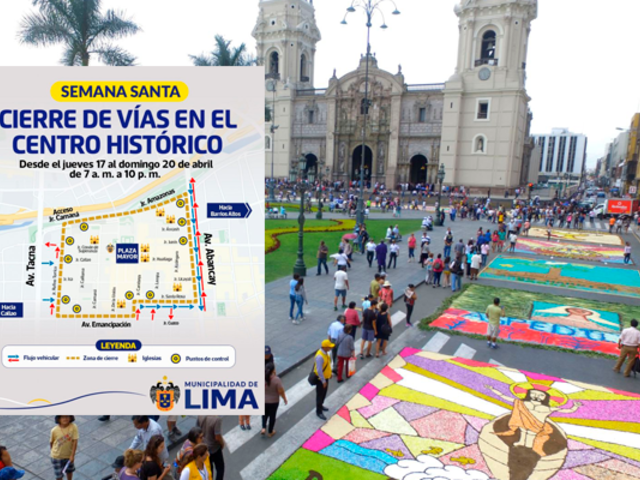 Con el objetivo de garantizar la seguridad de millas de feligreses y visitantes durante las celebraciones de Semana Santa 2025, la Municipalidad de Lima anunció el cierre temporal de calles en el Centro Histórico de la capital. La medida estará vigente desde el jueves 17 hasta el domingo 20 de abril, en el horario de 7 am a 10 pm, y busca asegurar un tránsito ordenado y prevenir incidentes durante las tradicionales procesiones religiosas.
