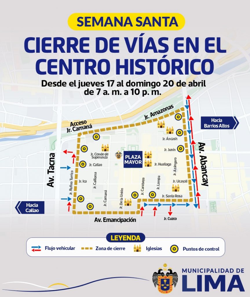 Además, se cerrarán intersecciones clave como los jirones Amazonas, Áncash, Junín, Lampa, Cailloma, Huancavelica, Callao, Conde de Superunda, Huallaga, Ucayali, Azángaro, Camaná e Ica, entre otros. Estas restricciones buscan facilitar el desplazamiento de los participantes en actividades religiosas y culturales programadas para Semana Santa en el corazón de la ciudad.
