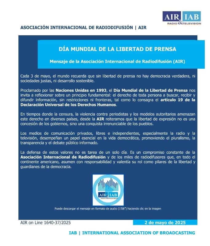 La defensa de estos valores no es tarea de un solo día. Es un compromiso constante de la AIR y de los miles de radiodifusores que, en todo el mundo, asumen con enorme responsabilidad y valentía su rol como pilares de la libertad y guardianes de la democracia.