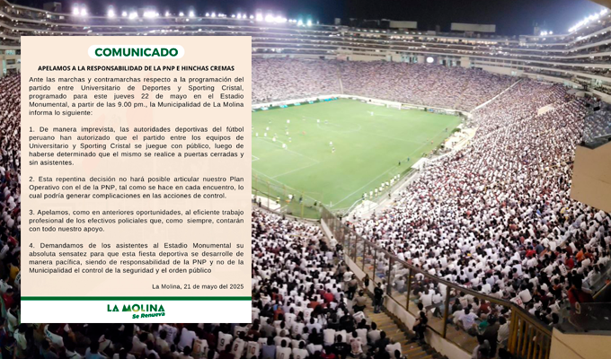 La Municipalidad de La Molina expresó su preocupación por la reciente decisión de permitir público en el partido entre Universitario de Deportes y Sporting Cristal, programado para el jueves 22 de mayo a las 9:00 p.m. en el Estadio Monumental. En un comunicado difundido en sus redes sociales, la comuna lamentó que “de manera imprevista, las autoridades deportivas del fútbol peruano han autorizado que el partido […] se juegue con público”, lo cual altera lo inicialmente previsto: un encuentro a puertas cerradas.