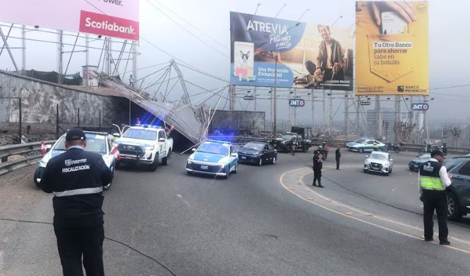 En el distrito de Santiago de Surco, un enorme letrero de metal colapsó colapsó en horas de la tarde de este jueves 31 en plena autopista del Cerro Centinela a raíz de los fuertes vientos registrados en Lima y regiones.