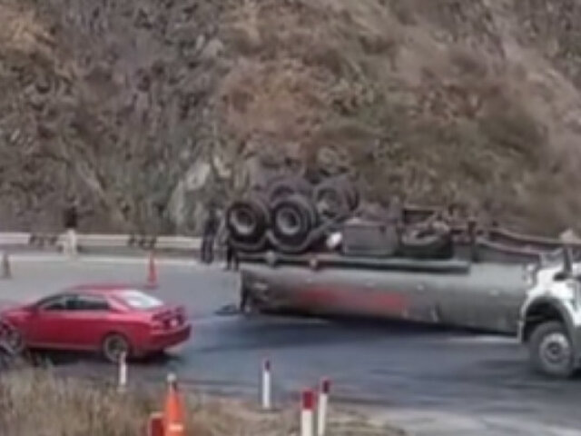 Esta mañana, un camión cisterna que transportaba combustible se despistó y se volcó en el kilómetro 81 de la Carretera Central, en la curva conocida como Huallatupe.