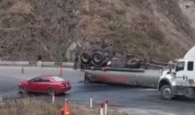 Esta mañana, un camión cisterna que transportaba combustible se despistó y se volcó en el kilómetro 81 de la Carretera Central, en la curva conocida como Huallatupe.